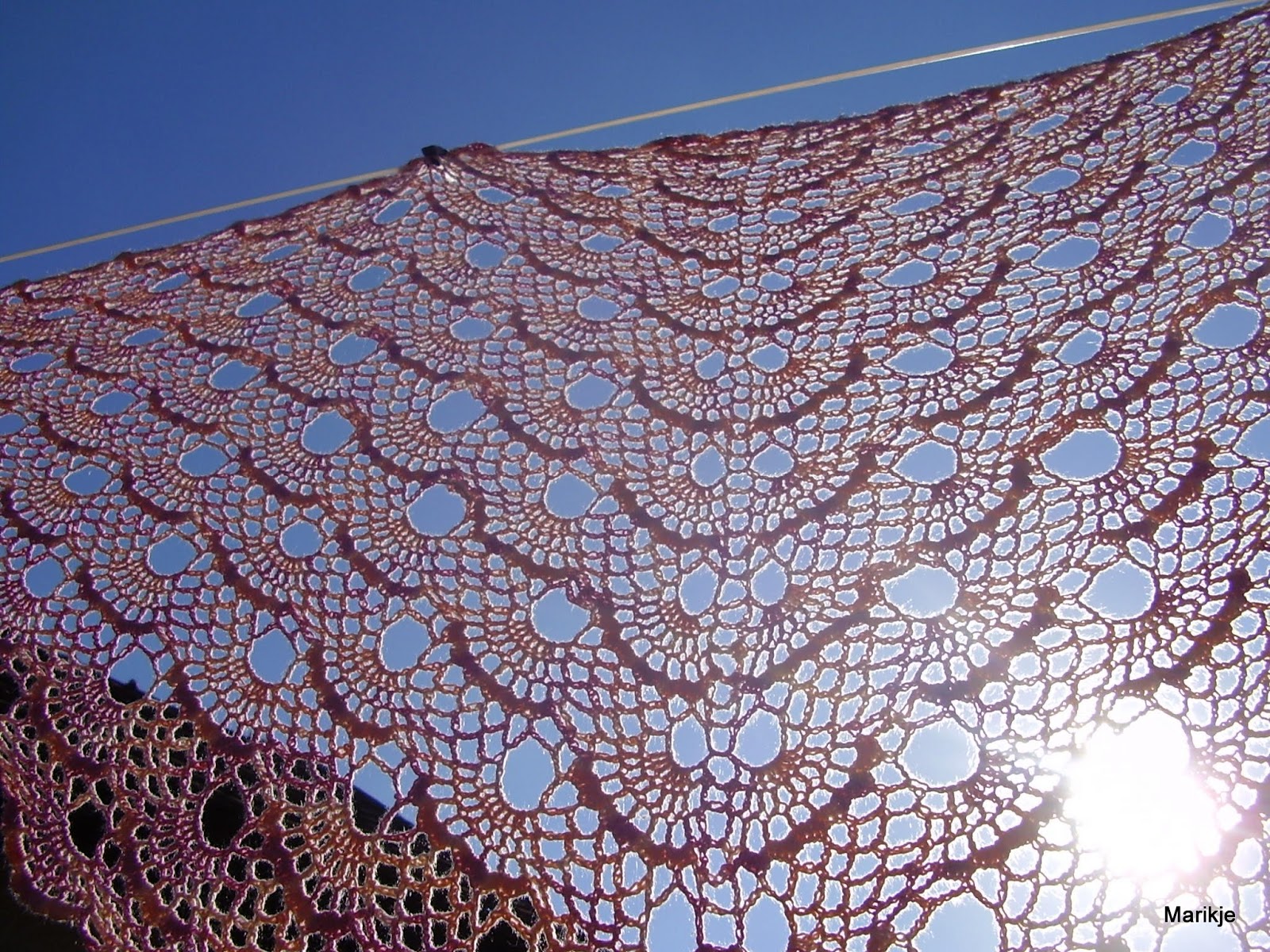 Felbátorodva a Mama kendőjén úgy döntöttem a Janka tanár nénijének is egy kendőt készítek ajándékba. Erzsike néni nagyon szereti a padlizsán színt, így adta magát az ötlet, hogy a legalább két éve az ágyneműtartóban pihenő akciós Reatex-es horgoló fonal meglelje végső rendeltetését és egy ilyen lehelet finom csipke kendő legyen belőle.