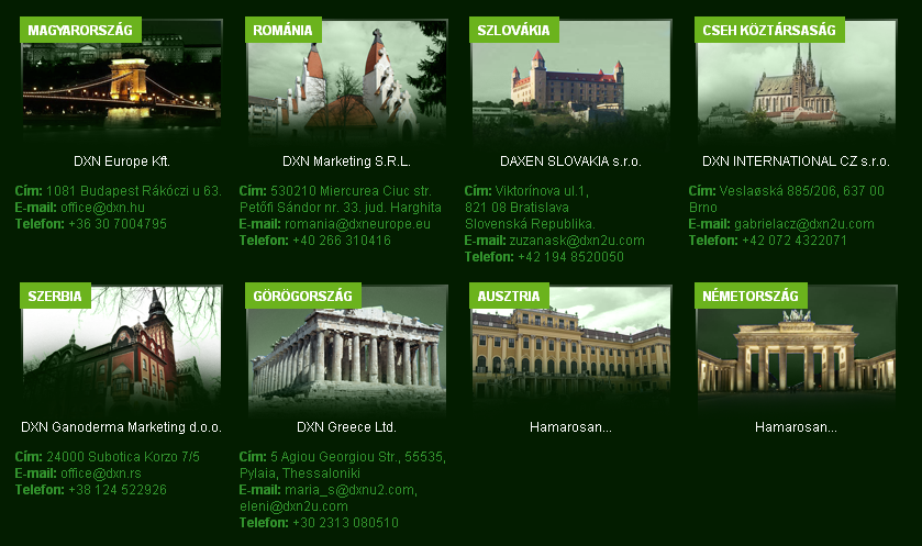 A honlapon aktuális hírek, promóciók, bemutatók, szervizcenterek és még sok hasznos információk érhetők el, melyek mind megoszthatók a közösségi oldalakon. A Magyarországi - DXN Europe Kft.- irodán kívül megtalálható még Ausztria, Csehország, Lengyelország, Németország, Románia, Szerbia, Szlovákia központi irodák elérhetőségei is.