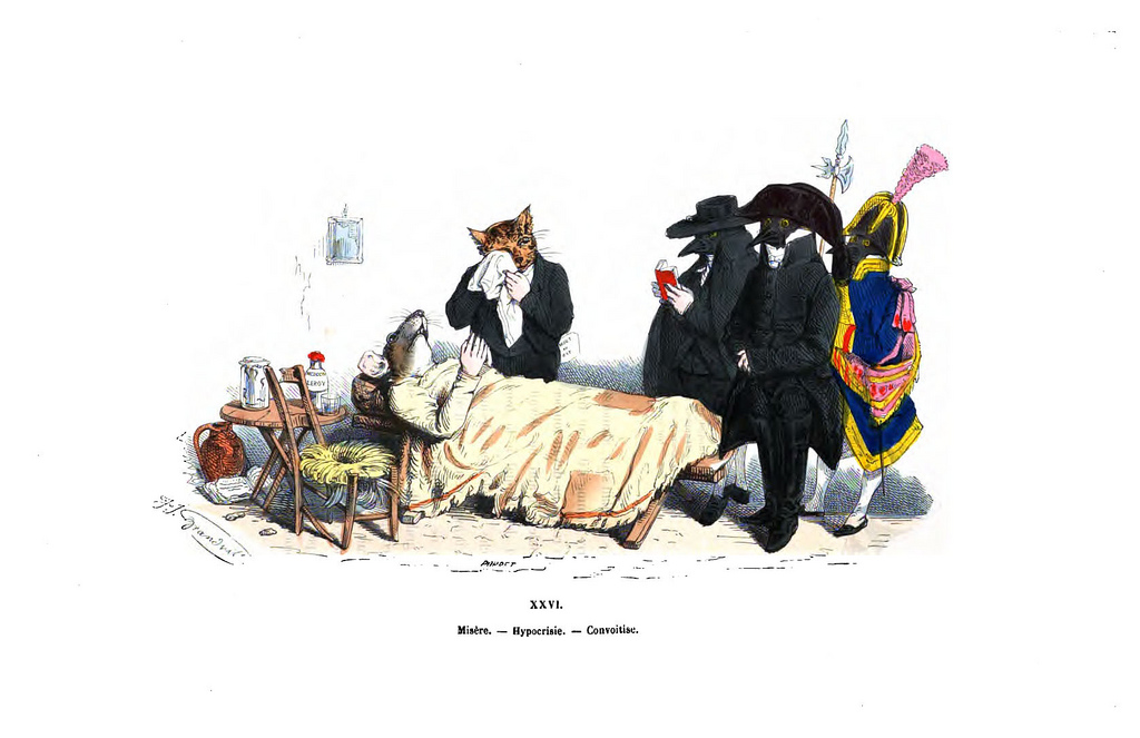 Grandville képeiben az a lenyűgöző, hogy az állatfejű és embertestű alakok egyáltalán nem nélkülözik az ökonómiát, sőt úgyszólván természetesek. Tökéletesen valósítják meg a korszak hétköznapjainak ábrázolását; az állatalakok emberi jellemet hordoznak; a XIX. századi kispolgári lét korrajzát állítják elénk. Az állatfejek nem ütnek el az embertestektől, döbbenetes hitelességgel állítanak elénk egy-egy embertípust. Éppen akkor, amikor a korabeli irodalom is a típusok ábrázolását tűzte célul maga elé…